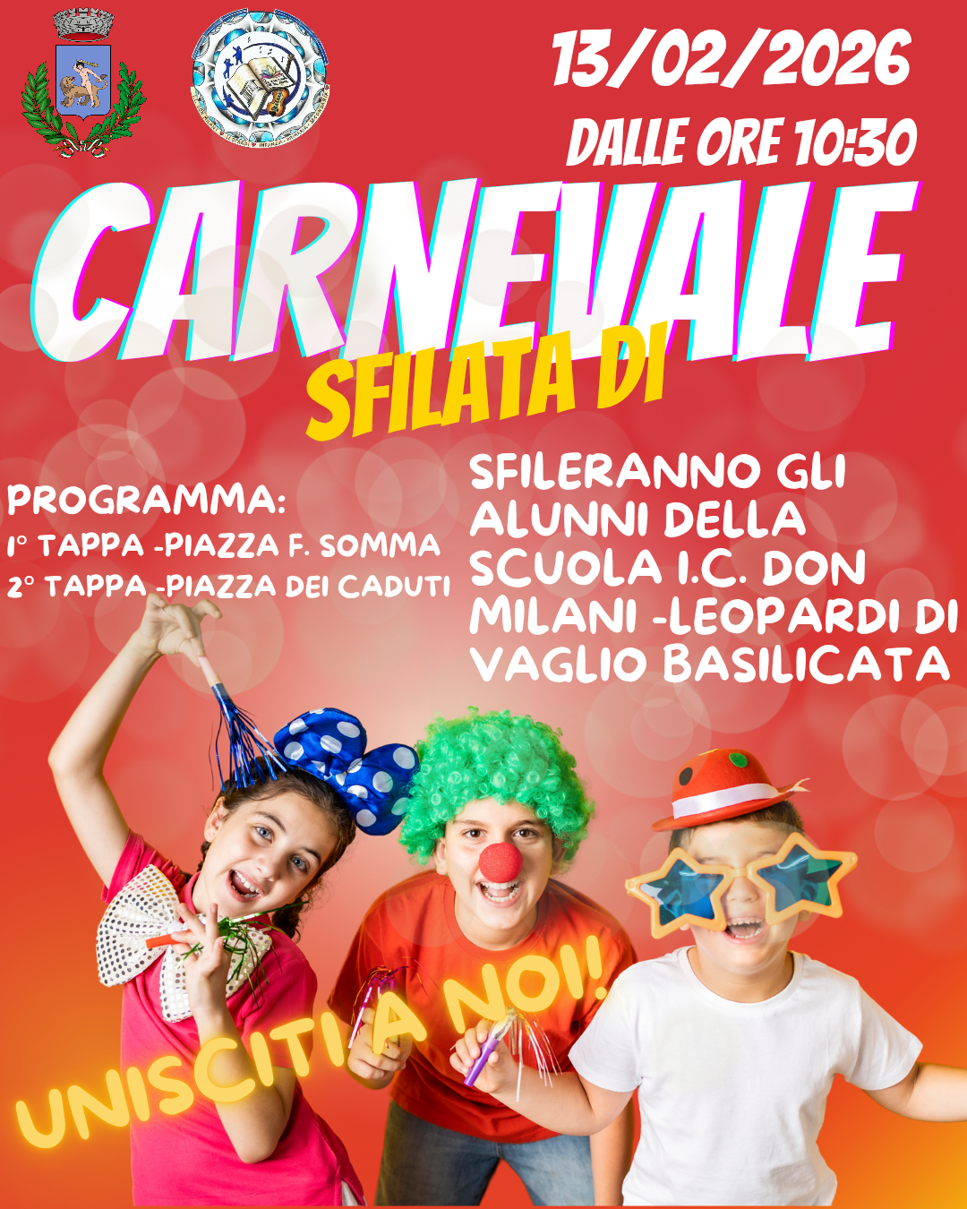 Testo completo title COMUNE DI VAGLIO BASILICATAProvincia di Potenza Sfilata di Carnevale Si rende noto che giovedì 13 febbraio 2026, a partire dalle ore 10:30, si terrà a Vaglio Basilicata la tradizionale manifestazione del Carnevale con una colorata sfilata che vedrà protagonisti gli alunni dell’Istituto Comprensivo “Don Milani – Leopardi”. L’iniziativa, organizzata sul territorio comunale, prevede un percorso articolato in due tappe: la prima in Piazza F. Somma e la seconda in Piazza dei Caduti. Gli studenti sfileranno in maschera, animando le vie cittadine con entusiasmo, creatività e spirito di festa. L’evento rappresenta un momento di condivisione e aggregazione per l’intera comunità, con l’obiettivo di valorizzare le tradizioni carnevalesche e promuovere la partecipazione attiva dei più giovani. La cittadinanza è invitata a partecipare numerosa per sostenere i ragazzi e vivere insieme una mattinata all’insegna del divertimento e della convivialità.